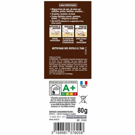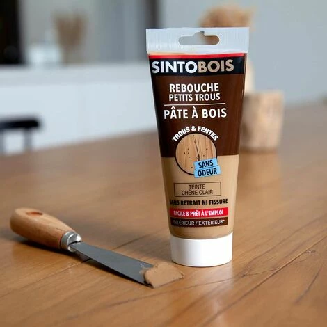 La pâte à bois Rebouche imperfections Sintobois répare les fissures et trous de vers ou de clous sur les mobiliers en bois, les portes, les fenêtres, les escaliers… que ce soit à l’intérieur ou à l’extérieur. Pour les trous ou les fissures plus larges, consultez notre guide pour vous aider dans le choix du bon produit.Sans odeur, la pâte à bois Rebouche imperfections Sintobois se travaille en 30 minutes avant le début du durcissement. Il sèche en 4h, sans se retracter. Attendre 2h si vous choisissez d’appliquer une deuxième couche. Une fois sec, la pâte à bois Rebouche imperfections Sintobois se ponce, se perce, se visse…La pâte à bois Rebouche imperfections Sintobois existe en plusieurs teintes : Chêne moyen, Chêne foncé, Chêne clair, Merisier, Acajou, Pin, Blanc, Naturel. Il accepte toutes finitions : vernis, peinture, lasure… (obligatoire pour un usage extérieur).