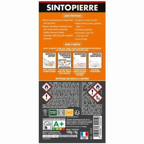 Préparation du support :Poncer et dépoussiérer le support.Application :Mélanger 100g de mastic avec 2g de durcisseur (soit environ une cuillère à soupe pour un grain de café).Mastiquer la partie à réparer à l’aide d’une cale métallique ou caoutchouc.Si vous souhaitez une teinte sur mesure, mélanger au préalable différentes teintes de mastic sintopierre entre elles ou colorer le avec des colorants en poudre ou des colorants universels pour peintures (à base organique). Finition :Après ponçage à sec, le produit peu recevoir tous types de finition : cires, vernis, colorants et peintures. Attention le mastic sintopierre ne peut pas recevoir de revêtement en phase aqueuse.Après 24 heures :le produit peut être poncé, percé, travaillé à l’aide d’outils traditionnels pour la pierre ou machines-outils. Le mastic peut être poli à l’aide de poudres à polir ou tout autre agent de polissage. Le mastic est inattaquable par les acides et bases moyennement concentrées, l’essence, le gasoil, les huiles et les solvants. Nettoyage des outils :Avec des solvants de nettoyage type acétone, alcool.